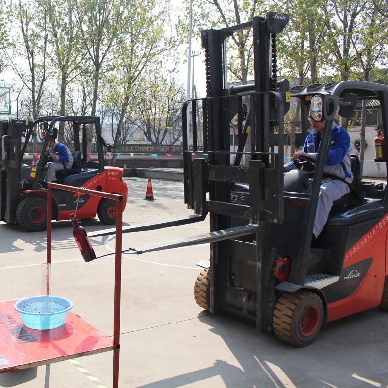 繞柱競(jìng)速,場(chǎng)地?cái)[放五個(gè)樁,比賽要求選手叉起擺放可樂罐的玻璃板,繞樁行駛一個(gè)來回,將玻璃板放回原處,同時(shí)駕駛途中要保持可樂罐不倒。本項(xiàng)目考驗(yàn)叉車工駕駛叉車的速度和操作的穩(wěn)定性,是速度與技術(shù)的綜合較量。