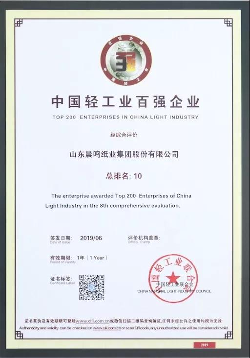 中國(guó)輕工業(yè)百強(qiáng)企業(yè)是輕工行業(yè)的優(yōu)秀代表,是引領(lǐng)中國(guó)輕工業(yè)從大國(guó)向強(qiáng)國(guó)邁進(jìn)的先進(jìn)力量。本次輕工業(yè)百強(qiáng)評(píng)選,晨鳴再次取得前十強(qiáng)的好成績(jī),是企業(yè)綜合實(shí)力的體現(xiàn),也是中國(guó)輕工業(yè)聯(lián)合會(huì)等業(yè)界對(duì)集團(tuán)成績(jī)的高度認(rèn)可。晨鳴集團(tuán)將以此為契機(jī),不忘初心,牢記使命,堅(jiān)定不移推動(dòng)高質(zhì)量、可持續(xù)發(fā)展,為“振興民族造紙工業(yè)”而不懈努力!